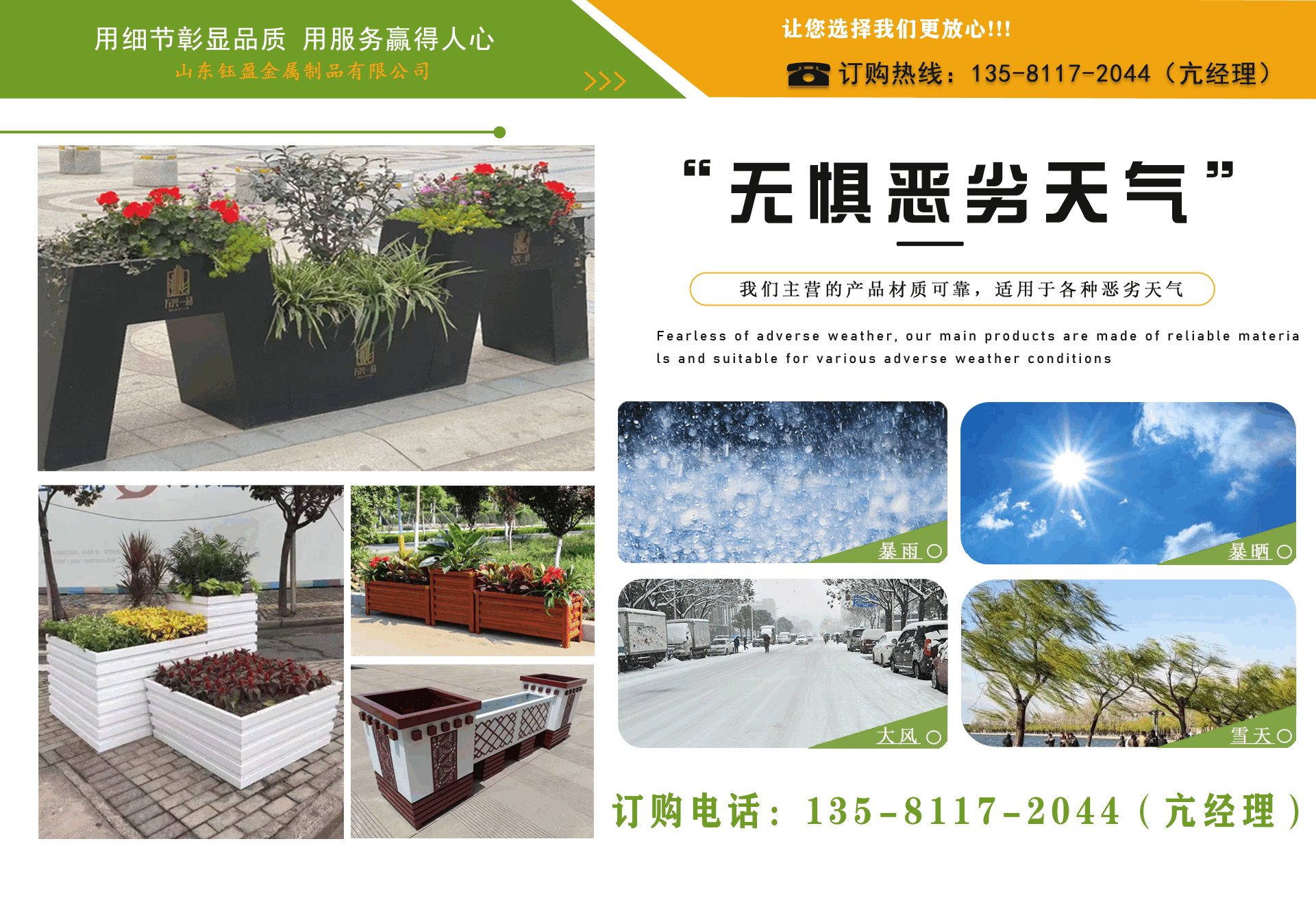 山東鈺盈金屬制品有限公司主營(yíng)鍍鋅板花箱,道路隔斷花箱,定制花箱,戶外道路花箱,花箱座椅等產(chǎn)品,產(chǎn)品結(jié)構(gòu)合理、性能優(yōu)良,具有強(qiáng)度高、耐腐蝕、抗老化、隔熱隔音、節(jié)約能源、外形美觀、使用壽命長(zhǎng)等優(yōu)點(diǎn),深受國(guó)內(nèi)外客戶認(rèn)可?! ∥覀兏鶕?jù)客戶所在城市的文化特征,制造出符合當(dāng)?shù)爻鞘形幕瘹庀⒌淖匀涣Ⅲw、觀賞性強(qiáng)的花箱產(chǎn)品成為城市里一道靚麗的風(fēng)景線?! 」緦?shí)行誠(chéng)實(shí)、公正、守信、價(jià)格合理、平等互利?! 」緫{借雄厚經(jīng)驗(yàn)實(shí)力,恪守誠(chéng)信為本的原則,得到了眾多客戶的信賴,并在業(yè)界獲得良好的口碑。建立了穩(wěn)固的合作關(guān)系,隨著業(yè)務(wù)的不斷發(fā)展和壯大,合作伙伴的范圍也在不斷擴(kuò)大。我們熱情盼望與您的合作,為社會(huì)的可持續(xù)發(fā)展獻(xiàn)上一份努力。...